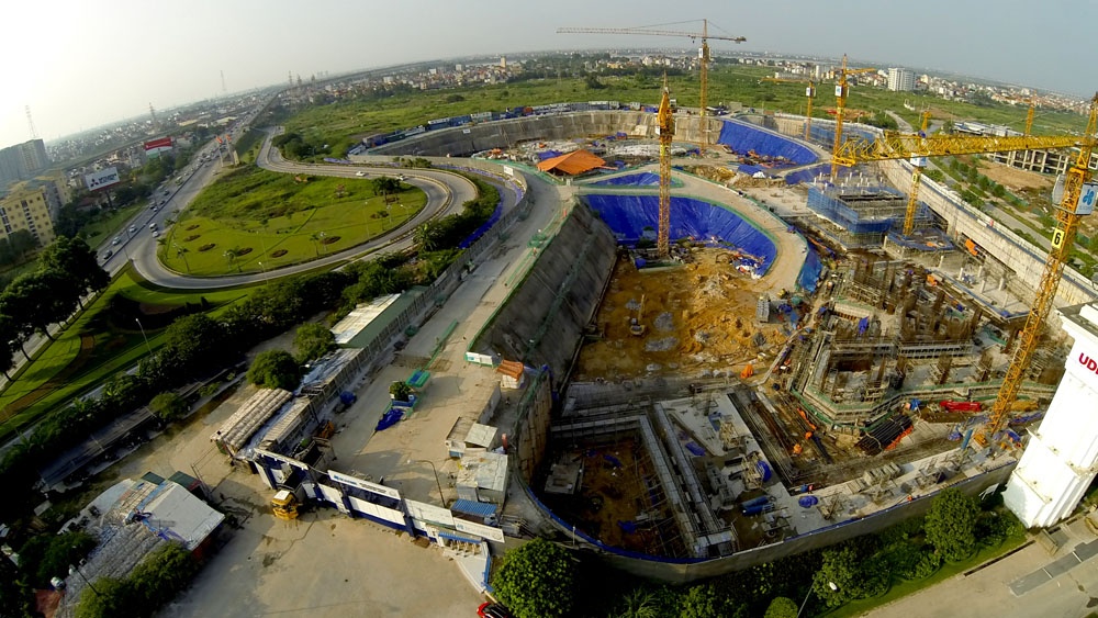 Được khởi công năm 2010, VietinBank Tower dự kiến sẽ hoàn thành vào năm 2014 và trở thành tòa nhà cao thứ hai Hà Nội, sau Keangnam. Tuy vậy, đến thời điểm này, sau gần 4 năm thi công, công trình này vẫn đang ngổn ngang, dang dở. Trong ảnh là phối cảnh tòa tháp và thực tế hiện tại. |