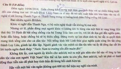 Cụ thể, trong câu hỏi số 2 của đề thi có nêu: "Đêm 14/6, Gala chung kết Gương mặt thân quen với sự chiến thắng tuyệt đối của chàng trai 19 tuổi Hoài Lâm. Nam ca sĩ này đã trở nên xuất thần khi hóa thân vào vai cố nghệ sĩ cải lương Thanh Nga và Thanh Sang trong vở tuồng kinh điển Tiếng trống Mê Linh. Bao nhiêu người đã khóc. Khóc vì nghĩ đến Thanh Nga, vì bộ môn nghệ thuật vẫn không bị mai một. Nhưng có lẽ, phần đông mọi người khóc vì không khí bi hùng của một thời kỳ vang bóng... Không khí ấy, con người ấy khiến cho anh/chị mở ra một góc nhìn như thế nào về lòng tự hào dân tộc của con người Việt Nam? Khí thế và lực nước ta còn yếu, theo anh/chị, tuổi trẻ phải có hành động thực tiễn nào để phát huy tinh thần đó trong bối cảnh hiện tại. Hãy viết một bài văn ngắn (không quá 600 từ) thể hiện suy nghĩ của mình"