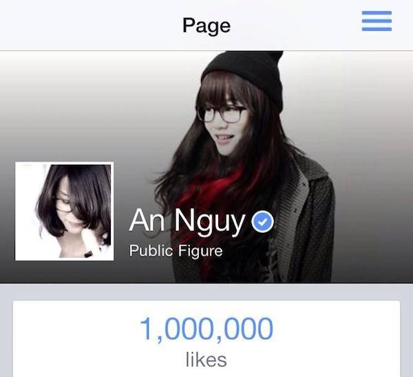 An Nguy là cái tên mới nhất trong số các hot teen Việt gia nhập “câu lạc bộ” trên triệu like Facebook. Mới đây cô nàng vlogger cá tính và xinh đẹp này chia sẻ một hình ảnh chụp lại khoảnh khắc fanpage của cô chạm mốc tròn 1 triệu lượt like với lời nhắn: “Cảm ơn mọi người. Về tất cả”.