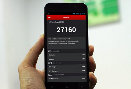 Ngoài ra, HKPhone cũng sở hữu những sản phẩm trang bị chip lõi 8, điển hình là chiếc Revo LEAD8. Máy đạt hơn 27.000 điểm Antutu benchmark.