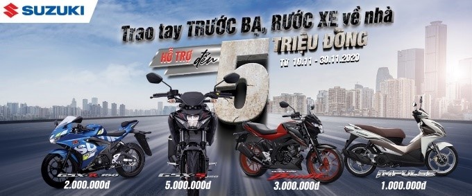 Nhằm tạo điều kiện cho khách hàng sở hữu những mẫu xe máy chất lượng nói trên, Suzuki triển khai chương trình khuyến mãi đặc biệt trong tháng 11. Cụ thể, từ 10/11 đến 30/11, khách hàng mua xe Suzuki được hỗ trợ phí trước bạ đến 5 triệu đồng cho 4 dòng xe GSX S150, GSX150 Bandit, GSX R150 và Impulse 125 FI, với số khung lần lượt là RLSDL22DN*V******, MH8DL24AN*J9*****, RLSDL23DN*V****** và RLSCF4EYN*V******. Bạn đọc tham khảo thêm tại đây.