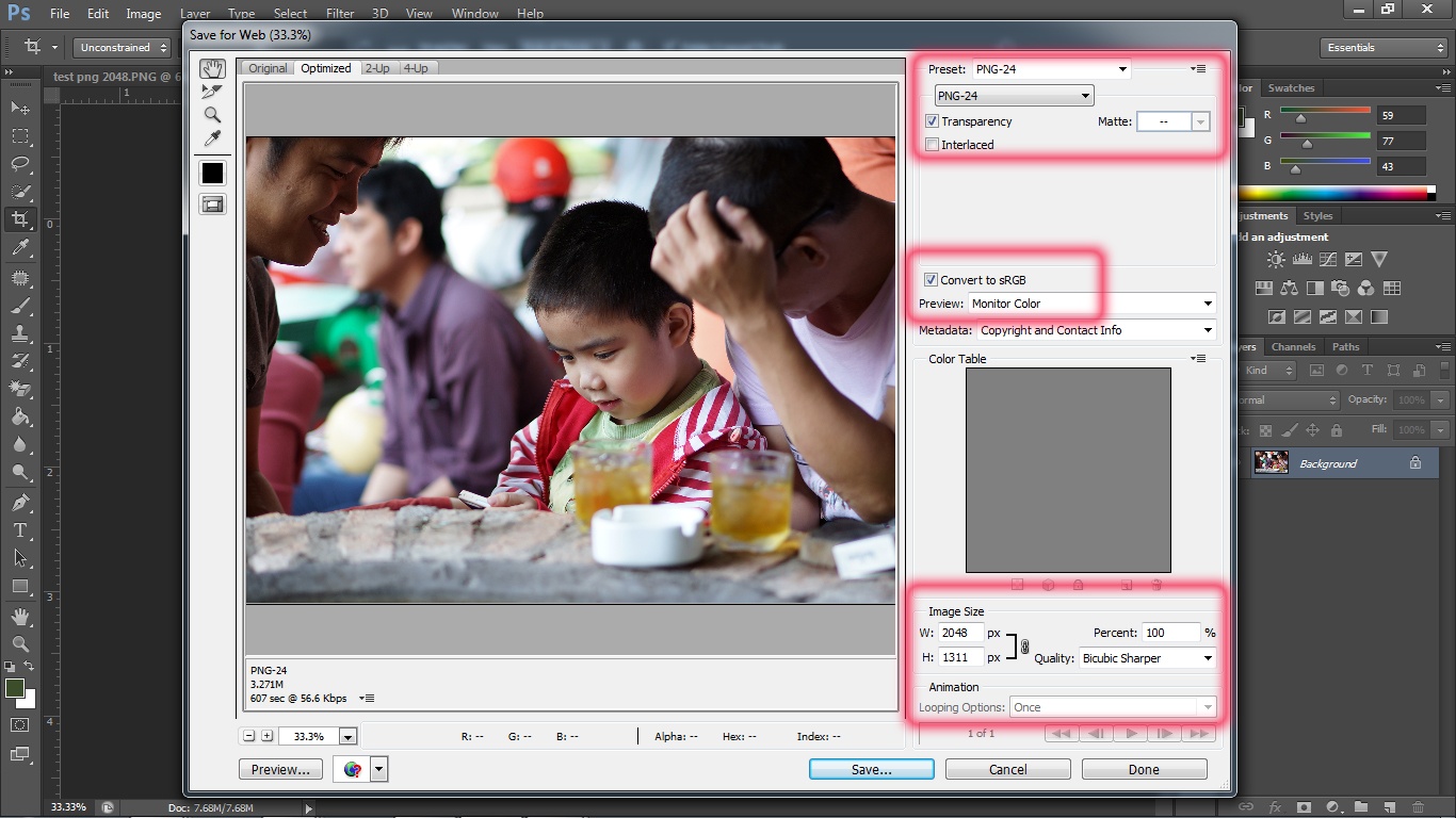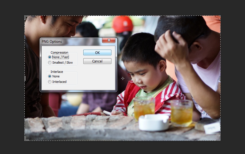 Để bức ảnh hiển thị đúng màu sắc so với ảnh gốc trên máy, Facebook khuyến khích người dùng sử dụng hệ màu sRGB. Trong khi đó, định dạng PNG không nén sẽ mang lại chất lượng hình ảnh tốt nhất khi upload lên Facebook. Hệ màu sRGB thường được chọn mặc định trên các máy ảnh số, nên người dùng ít phải quan tâm đến yếu tố này. Việc còn lại đơn giản chỉ là lưu file đã resize từ định dạng JPEG thành PNG( Nhấn tổ hợp phím Shift + Ctrl + S, chọn định dạng PNG, bấm save, chọn None/Fast khi hộp thoại PNG Option hiện ra.