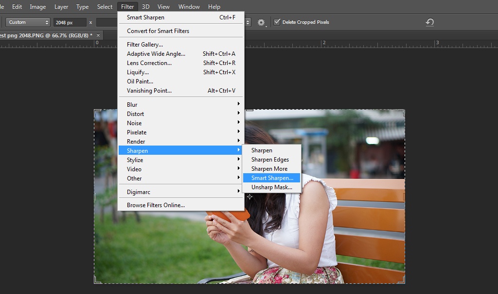 Với những người dùng thông thạo Photoshop hoặc các trình sửa ảnh có chức năng tương tự, việc làm nét ảnh trước khi upload lên Facebook có thể giúp ảnh bớt bị giảm chi tiết. Đối với phần mềm Adobe Photoshop, bạn có thể vào mục filter-> Sharpen -> Smart Sharpen, điều chỉnh các thông số để bức ảnh trông nét hơn. Bước này đặc biệt phát huy tác dụng với ảnh chụp thiên nhiên, cây cỏ, kiến trúc. Với những bức ảnh chân dung, việc làm nét có thể làm làn da của chủ thể xuất hiện "nhiễu hạt", kém mịn màng, nên không cần thiết phải áp dụng.