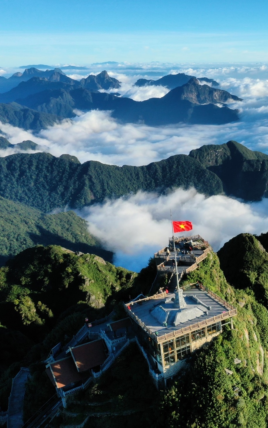 | Thu sang, nhiếp ảnh gia, du khách đủ mọi lứa tuổi lại “phát cuồng” với Fansipan, bởi khi đó, những áng mây cuồn cuộn chảy như dòng sông trên đỉnh thiêng. Nhìn từ đỉnh cao 3.143 m, một biển mây ùn đến tận chân trời, đẹp tựa chốn bồng lai. Thi thoảng mây quang dần, khung cảnh Sa Pa hiện ra mờ ảo, như thể có ai đó đang vén mây trời, để ta được ngắm sự bình yên và cả sự chuyển mình mạnh mẽ của thị xã. |