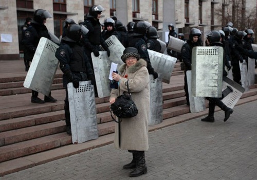 | Cảnh sát chống bạo động Ukraina ở trụ sở tòa nhà công quyền thành phố Donetsk. Ảnh: Getty. |
