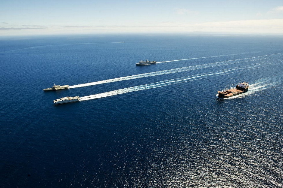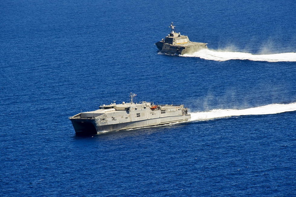 Các tàu Mỹ từ trái sang phải: tàu đổ bộ lớp San Antonio, tàu chiến đấu ven biển LCS-2, tàu đổ bộ siêu tốc đa năng JHSV-1 và tàu đổ bộ cơ động USNS Montford Point.