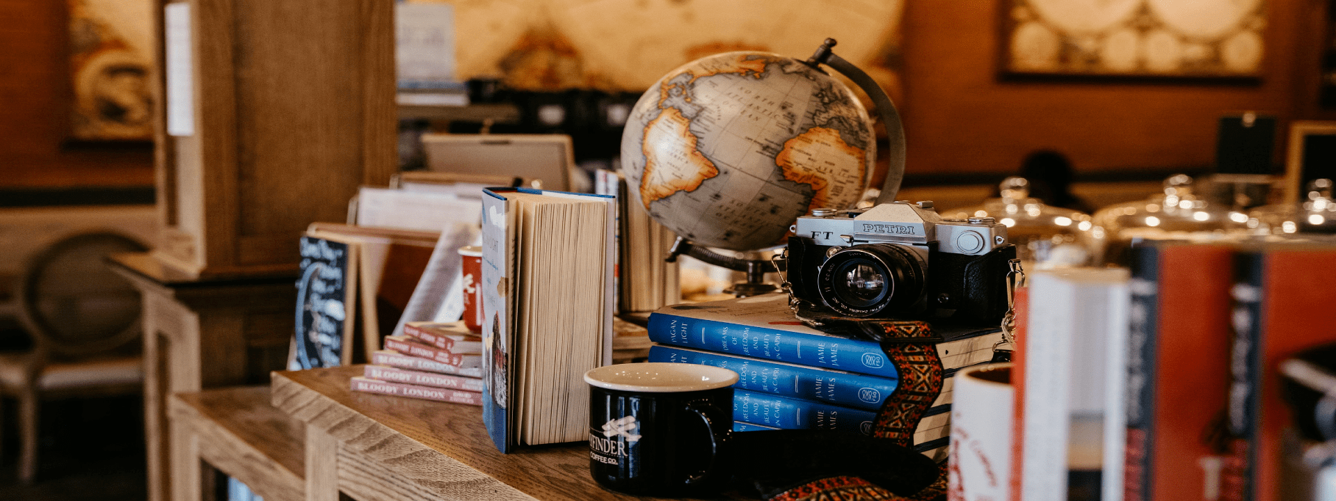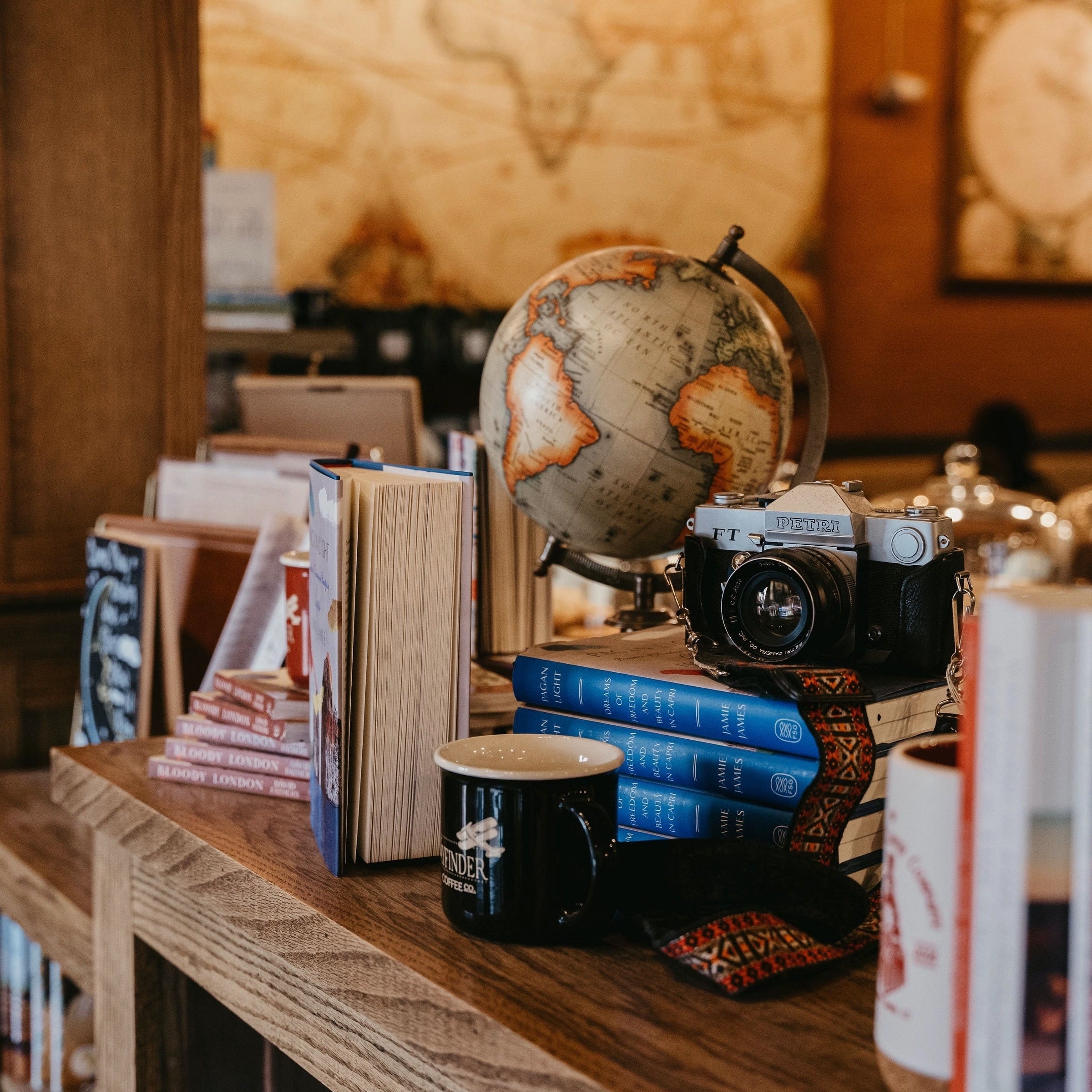 Tiệm có tầng trệt và gác lửng, diện tích hạn chế nhưng vẫn mang đến cảm giác dễ chịu khi ngồi nhâm nhi cà phê. Qua lời giới thiệu của bạn nhân viên, tôi tình cờ biết những món đồ cổ trang trí tại đây hầu hết do chủ quán góp nhặt qua nhiều năm. Góc tôi ưng ý nhất chính là khu vực có tấm bản đồ lớn.