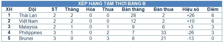 Sau hai lượt trận, ĐT Việt Nam cùng được 6 điểm như chủ nhà Thái Lan nhưng phải đứng sau do thua về chỉ số phụ. Ngày mai thầy trò HLV Sergio Gargelli sẽ đụng Brunei và tới ngày 23/10 có trận đấu quyết định với Thái Lan.