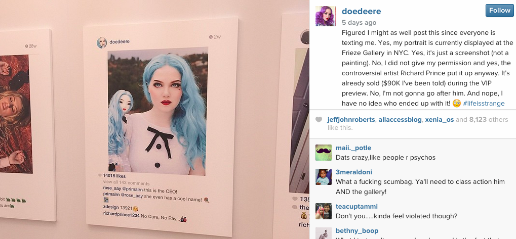 Tháng 5/2015, nghệ sĩ Richard Prince mở triển lãm New Portraits với nhiều hình ảnh từ Instagram, chỉnh sửa và trưng bày. Có bức ảnh đã được bán với giá lên tới 100.000 USD tại Hội chợ Frieze Art.