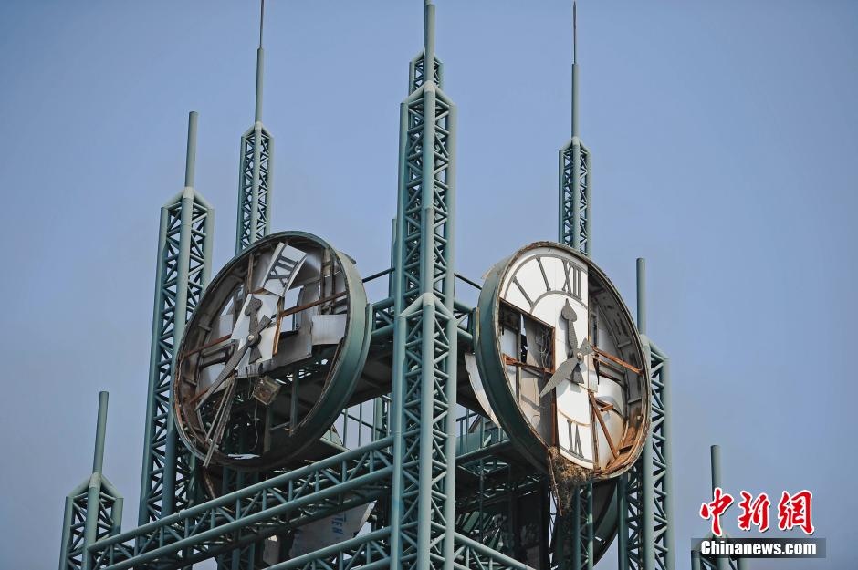 Đồng hồ ở khu công nghiệp hư hại và dừng lại ở thời khắc vụ nổ xảy ra. Ảnh: Chinanews