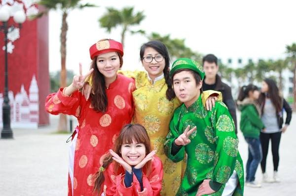 | Trang phục áo dài khăn đóng nổi bật trong đám đông. |