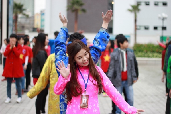 | Những thành viên nhóm nhảy Handi Crew mặc áo dài, khăn xếp với ba màu đỏ, vàng, xanh biểu trưng cho may mắn, tài lộc, phú quý. Đây cũng là những bạn trẻ có kinh nghiệm về vũ đạo, có nhiệm vụ hướng dẫn và làm mẫu cho đám đông gần 400 người còn lại hoàn thành màn trình diễn ấn tượng. |
