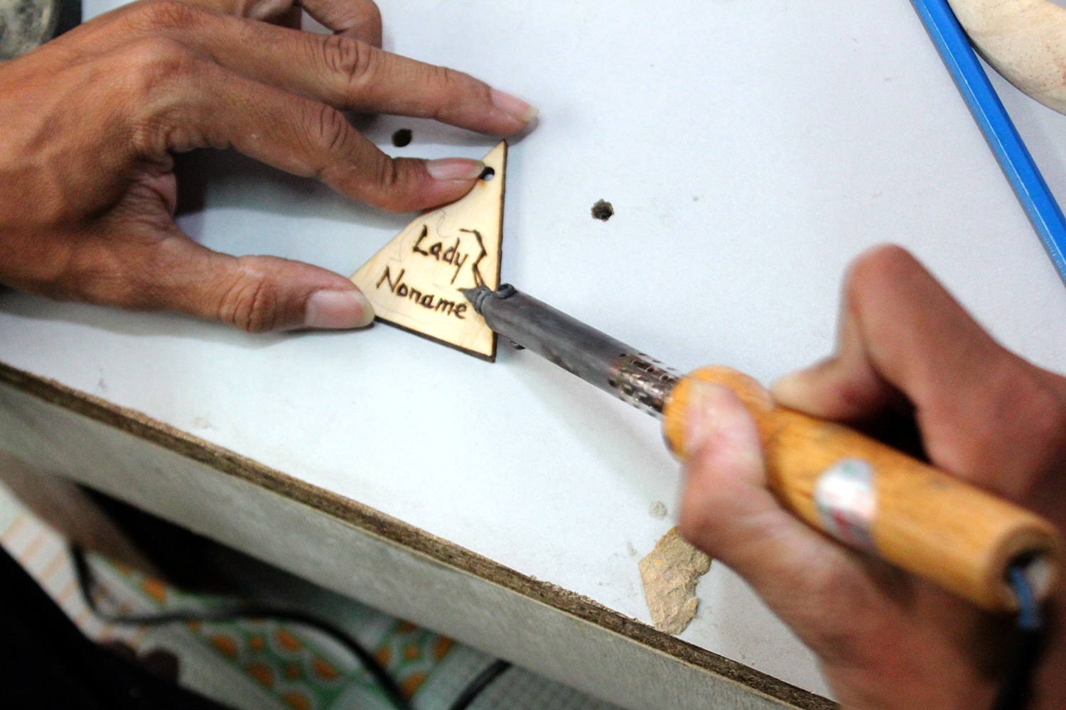 | Món đồ nghề tiếp theo cũng khá quan trọng cho phần chế tác chính là chiếc mỏ hàn điện. Đây là phương tiện được anh Khoa dùng để tạo nên những hoa văn, màu sắc, khắc chữ lên gỗ... Hiện nay cơ sở của anh cũng nhận khá nhiều đơn hàng khắc tên "chính chủ", như khắc tên lên mặt dây chuyền, nhẫn... bằng gỗ này. |