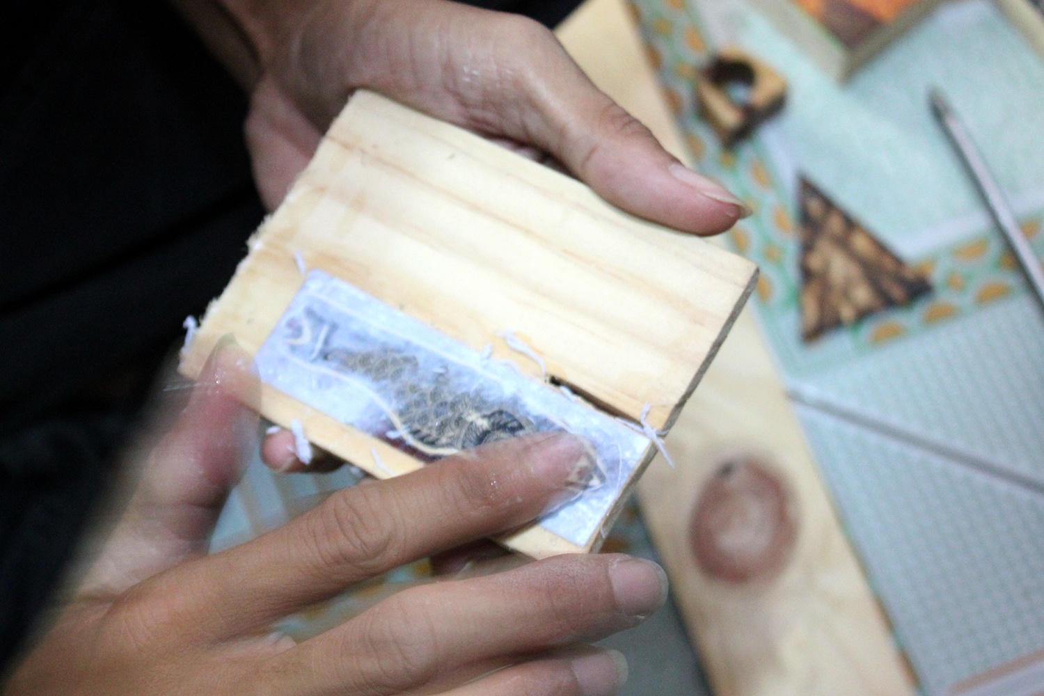 | Đầu tiên hình được in bằng máy in màu laser trên giấy A4 thường. Sau đó anh dùng một loại keo đặt biệt có màu sắc giống sữa quét đều lên hình và gỗ. Tấm hình sẽ được dán úp vào miếng gỗ và để qua đêm cho khô... |