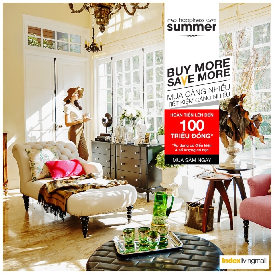 Khuyến mãi chào hè, Index Living Mall áp dụng chương trình Happiness summer: mua càng nhiều tiết kiệm càng nhiều từ ngày 17/6 đến 19/7. Theo đó, khách sẽ được: - Giảm giá giữa năm ưu đãi lên đến 50% đến ngày 19/7. |