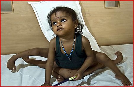 | Bé Lakshmi Tatama chào đời năm 2005 với 8 chi tại quận Araria, Ấn Độ. Các chuyên gia y tế cho rằng thực chất bé Lakshmi bao gồm một người anh em song sinh với phần đầu và ngực phát triển chưa hoàn thiện. Ngày 6/11/2007, 30 bác sĩ tại bệnh viện Sparsh ở Bangalore, Karnataka phẫu thuật cho bé. Sau 27 giờ, ca mổ thành công tốt đẹp. Một tuần sau, các bác sĩ tại bệnh vện Sparsh tổ chức cuộc họp báo. Bé Lakshimi xuất hiện trong vòng tay của bố. Chân bé vẫn băng bó. Tiếp đó, các bác sĩ đã tiến hành những ca phẫu thuật tiếp theo để bé Lakshmi có thể đi lại bình thường. Ba tháng sau ca phẫu thuật đầu tiên, bé gái Ấn Độ sinh năm 2005 đã chống nạng đi lại được. Những ngày tháng sau đó, bé tới trường như bao bạn bè khác. Ảnh: Wiki. |