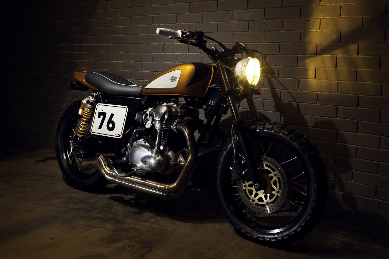 | Ton-Up Garage W650 ‘GoldDigger’: Hãng độ Bồ Đào Nha đã cho ra đời một chiếc GoldDigger dựa trên mẫu W650 2004 tuyệt đẹp. Bình nhiên liệu mỏng hơn so với nguyên bản, phần đuôi độc đáo tạo nên nét riêng biệt tích cực, kết hợp lốp xe off-road. Đặc biệt nổi bật với màu sơn vàng sang trọng, kết thúc bằng những điểm nhấn màu đen và trắng ngọc trai. |