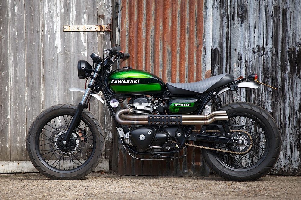 | Spirit of the Seventies W800 ‘SPIRIT’: Mẫu xe W800 của những năm 70 luôn niềm cảm hứng bất tận và thể hiện sự tôn trọng của những hãng độ với nhà sản xuất. Mẫu xe này thuộc Kawasaki của Anh. Chiếc SPIRIT được trang bị 3 sự lựa chọn khác nhau, và được bỏ phiếu thông qua Facebook để những khách hàng của Kawasaki có thể đưa ra quyết định màu sơn của SPIRIT. Cuối cùng phương án sơn cũng đã giữ lại được những di sản truyền thống của Kawasaki. Chiếc Spirit kết hợp sự thay đổi nhưng cũng giữ lại một số chi tiết: yên xe được rút ngắn, hệ thống giảm xóc tốt hơn. Hệ thống ống xả bằng thép không gỉ và nó là một tác phẩm nghệ thuật. |