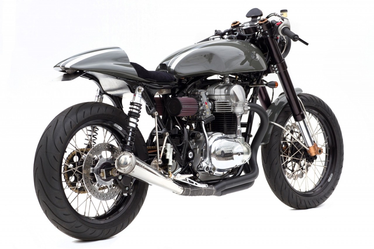 | Deus Ex Machina USA W650 của MOTO Grigio. Deus đã tạo nên những đường nét giúp chiếc W650 là một sự lựa chọn khéo léo. Những nâng cấp gồm giảm xóc của Ohlins, gắp sau có thể điều chỉnh. Phanh an toàn hơn khi và động cơ 800cc cũng được nâng cấp. Xe được sơn màu đen xanh, yên xe có thể điều chỉnh và đèn sau cũng tương tự. Moto Grigio để có thể sở hữu 1 chiếc xe tốt, mạnh mẽ. |