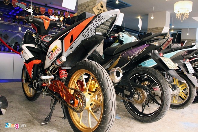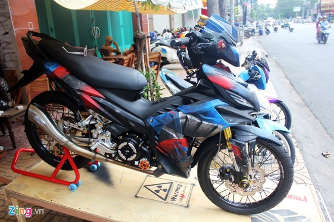 Chiếc Yamaha Exciter độ kiểu "cọp" thuộc sở hữu của một người chơi xe ở quận 1, TP.HCM. Cụm đèn hậu được thay thế bằng đèn LED gắn vào đuôi xe vuốt nhọn. Yên xe cũng được gọt mỏng cho cảm giác nhỏ hơn. Phần đầu xe chế mủ với các hốc hút gió. Thời gian hoàn thành khoảng một tuần. |