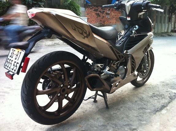 Yamaha Exciter 2011 độ phong cách bụi bặm của một người chơi xe ở Trà Vinh. Phần vỏ nhựa được chế mủ với mặt nạ góc cạnh, 2 cánh gà được cắt và tạo dáng ngầu, bụi bặm hơn. Đuôi xe vuốt cao với các hốc gió, đồng thời chế đèn đuôi BMW S1000RR. Thời gian hoàn thiện khoảng 2 tuần. |