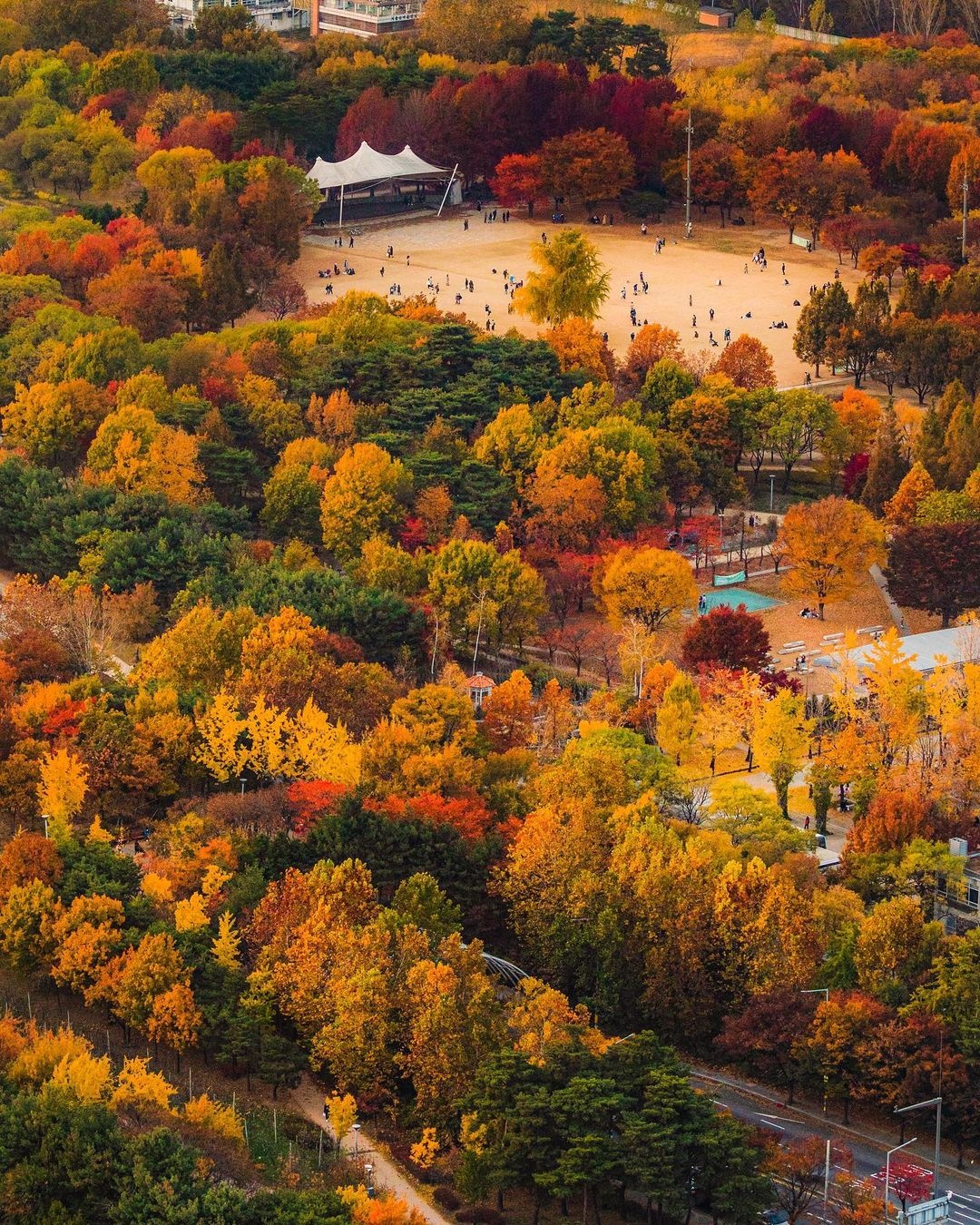 Rừng Seoul là một trong những công viên sinh thái lớn tại thủ đô Hàn Quốc. Nơi đây không không chỉ là lá phổi xanh của thành phố mà còn là điểm ngắm lá mùa thu tuyệt đẹp. Loại cây tạo nên điểm nhấn mùa thu lãng mạn cho địa điểm này là rừng bạch quả.