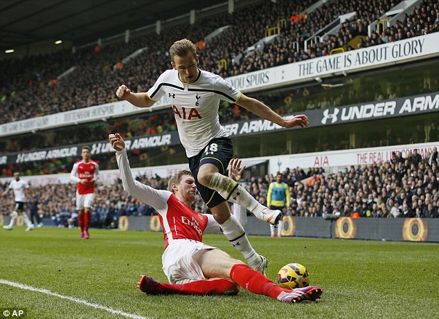 | Mertesacker sẽ phải khóa chặt tiền đạo chủ lực Harry Kane (áo trắng) của Tottenham. Ảnh: AP. |