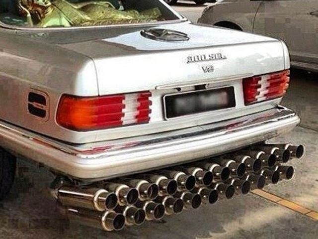 | Độ pô đòi hỏi sự kỳ công và thực sự hiểu về sức mạnh cũng như yếu tố kỹ thuật của xe. Trên thế giới, đã có rất nhiều chiếc xe tăng thêm được sức mạnh đáng kể khi được trang bị một hệ thống ống xả mới. Bên cạnh đó, chiếc pô mới cho âm thanh uy lực hơn, gây phấn khích người xem. Tuy nhiên, để chơi trội, không ít tay chơi đã quyết định gắn vào sau xe những hệ thống rườm rà. Chúng hoặc là hệ thống quá nhiều ống xả con (hình trên), hoặc là một ống xả nhưng với kích thước "khủng". Ngoài yếu tố bắt mắt và gây tò mò thì hệ thống ống xả dạng này bị đánh giá là làm yếu chiếc xe và "móc" thêm tiền từ chủ nhân. |