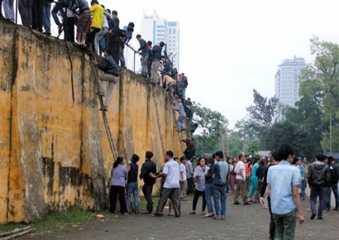 | Sân Chi Lăng vốn có sức chứa hơn 30.000 người nhưng vẫn không đủ để đáp ứng nhu cầu của khán giả để xem trận cầu đinh ở V.League 2009 giữa SHB.Đà Nẵng- B.Bình Dương. Rất đông khán giả đã tìm mọi cách leo rào, chen lấn, trèo tường để được vào sân trong sự bất lực của lực lượng an ninh. Ước tính số lượng khán giả vào sân lên đến 35.000 người biến đây thành trận đấu tại V.League đông người xem nhất từ trước đến nay. Hàng nghìn khán giả không có chỗ ngồi phải tràn xuống đường piste để xem trận đấu. Rất may trận đấu đã không xảy ra sự cố đáng tiếc nào nhưng ban tổ chức sân vẫn bị VFF phạt nặng. Ảnh: VNM/Thể thao Văn hóa. |
