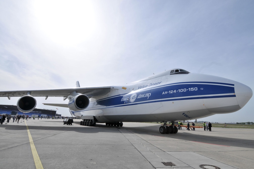| Trước khi Airbus A380F ra đời, Antonov An-124 Ruslan từng là loại máy bay lớn nhất được sản xuất hàng loạt. Về hình dáng, thiết kế của An-124 gần tương tự loại C-5 Galaxy của hãng Lockheed. Phi cơ thường chuyên chở đầu máy xe lửa, thuyền buồm, thân máy bay và nhiều hàng hóa ngoại cỡ khác. An-124 phiên bản quân sự có thể chở 150 tấn hàng hóa và 88 người. Tuy nhiên, vì khả năng điều áp hạn chế trong thân, nó hiếm khi chở lính dù. Ảnh: Daily Mail. |
