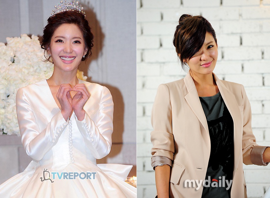 | Năm 2011, cựu thành viên nhóm nhạc nữ Sharp Seo Ji Young lên xe hoa. Trong ngày kết hôn, cô vui vẻ đón tiếp báo giới nhưng quyết "giấu kín" người chồng làm trong ngành tài chính. Ảnh: TVReport, mydaily |
