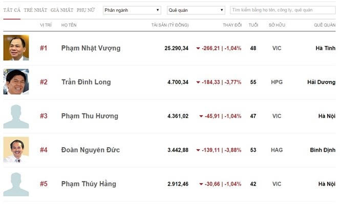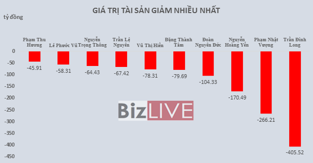 Trong khi xét về yếu tố gia đình, 3 chủ nhân của VIC là ông Phạm Nhật Vượng, bà Phạm Thanh Hương cùng bà Phạm Thúy Hằng là những người mất nhiều nhất. Tổng giá trị tài của họ đã hụt mất 343 tỷ đồng.