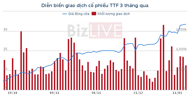 Đáng chú ý là cổ phiếu TTF đã tăng hơn 90% từ 17.200 đồng/cổ phiếu lên 32.7000 đồng/cổ phiếu trong vòng đúng 3 tháng trở lại đây. |