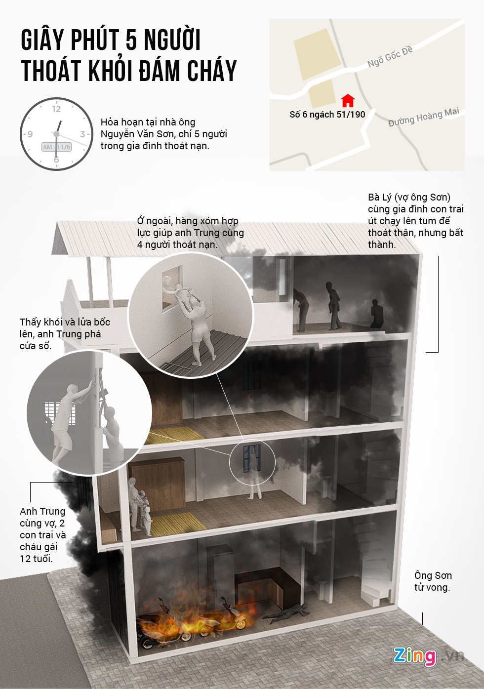 Thấy khói lửa bốc lên từ tầng 1, anh Trung vội vàng đập, phá cửa sổ tầng 2. Nhờ sự hỗ trợ giải cứu của hàng xóm, 5 người kịp thoát ra ngoài qua mái tôn nhà bên cạnh.