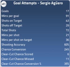 Khi Sergio Aguero có thể ra sân, anh là một trong những tiền đạo xuất sắc nhất thế giới. Vấn đề duy nhất là anh không thể làm điều đó thường xuyên cho Man City. Aguero đã trải qua nhiều chấn thương dai dẳng mùa trước và chỉ đá chính 20 trận ở Premier League. Tuy nhiên, anh đã ghi bàn ở 17 trong 23 lần ra sân, với tỉ lệ 1 bàn mỗi 91 phút. Tiền đạo người Argentina cũng có 6 đường kiến tạo và tạo ra một cơ hội dứt điểm cho đồng đội mỗi 44 phút. Dù Man City có một hàng công hùng hậu với Edin Dzeko, Alvaro Negredo và Stevan Jovetic, Aguero là tất cả những gì bạn cần ở một tiền đạo, và nếu chân sút 26 tuổi này có thể ra sân đều đặn trong mùa tới, cơ hội bảo vệ chức vô địch của Man City sẽ lớn hơn nhiều.