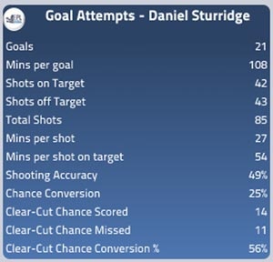 Sturridge vừa trải qua một mùa giải rất thành công ở Liverpool và đóng góp 21 bàn trong chiến dịch trọn vẹn đầu tiên của anh với The Reds. Tuyển thủ Anh tạo thành bộ đôi cực kỳ ăn ý với Luis Suarez. Cùng nhau, họ đã ghi 52 bàn khi Liverpool đua tranh cho chức vô địch tới những vòng đấu cuối cùng. Sturridge, 24 tuổi, ghi một bàn mỗi 108 phút, nhưng giống như Aguero, anh cũng vắng mặt khá nhiều vì chấn thương. Cựu tiền đạo của Chelsea và man City còn có 7 đường kiến tạo và tạo ra 29 cơ hội dứt điểm. Với việc Suarez giờ đã ra đi, anh được chờ đợi là trụ cột và nguồn cung cấp bàn thắng chính cho Liverpool mùa tới.