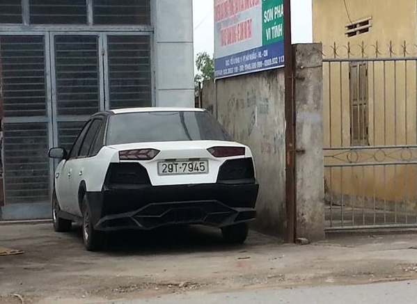 Một mẫu ô tô cũ biển số Hà Nội được chế lại với dáng dấp của mẫu siêu xe Lamborghini Aventador LP700-4. Điểm nhấn của chiếc xe chế này ở phần đầu và đuôi xe khi nó được làm góc cạnh. Ngoài ra, còn có cặp đèn hậu đặc trưng của Aventador.