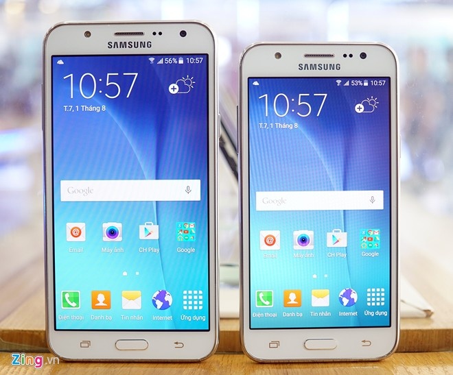 J7 là sản phẩm cao cấp hơn với chip Qualcomm Snapdragon 615 8 nhân, màn hình 5,5 inch HD, pin 3.000 mAh.