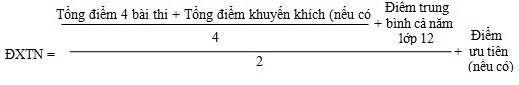 Điểm xét tốt nghiệp gồm điểm 4 bài thi thí sinh đăng ký để xét công nhận tốt nghiệp, điểm ưu tiên, khuyến khích (nếu có) và điểm trung bình cả năm lớp 12; được tính theo công thức sau.
