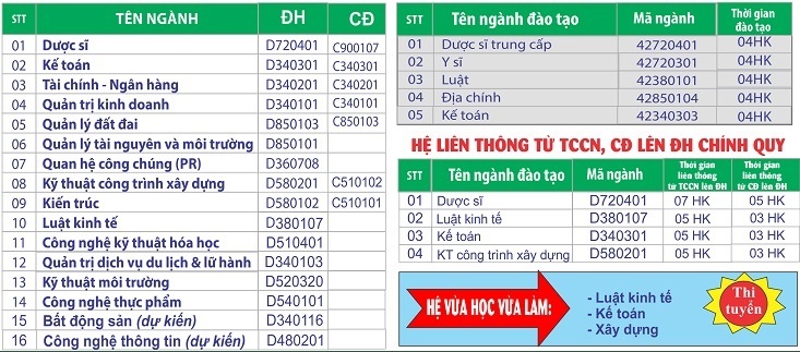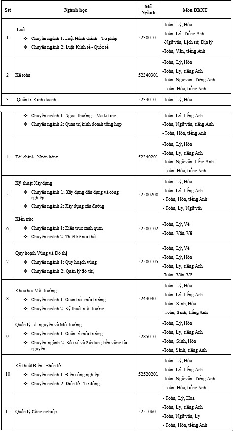 Danh sách ngành tuyển sinh và khối xét tuyển: