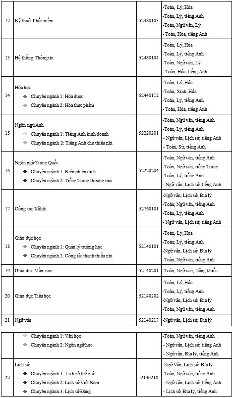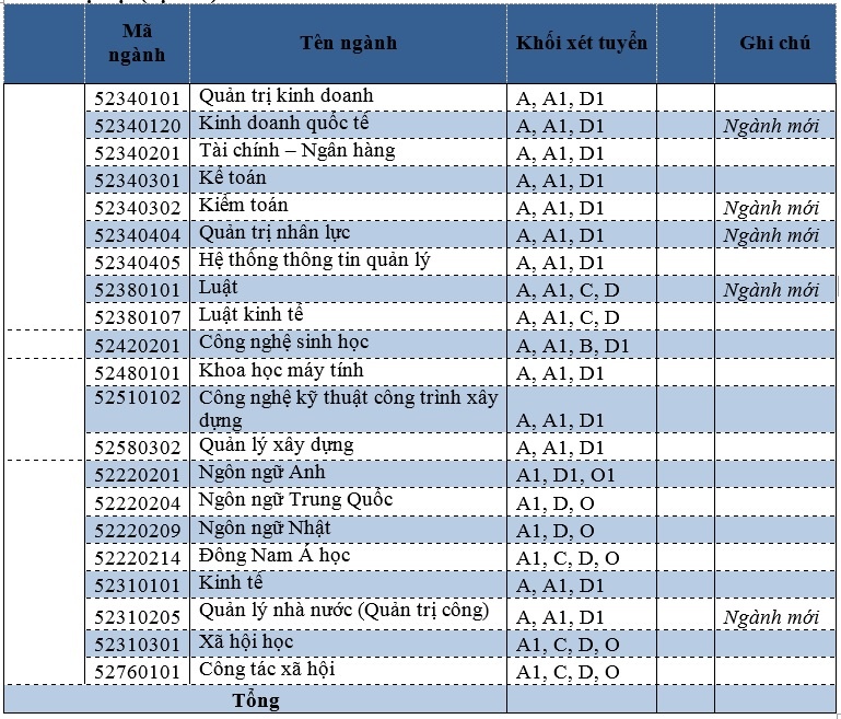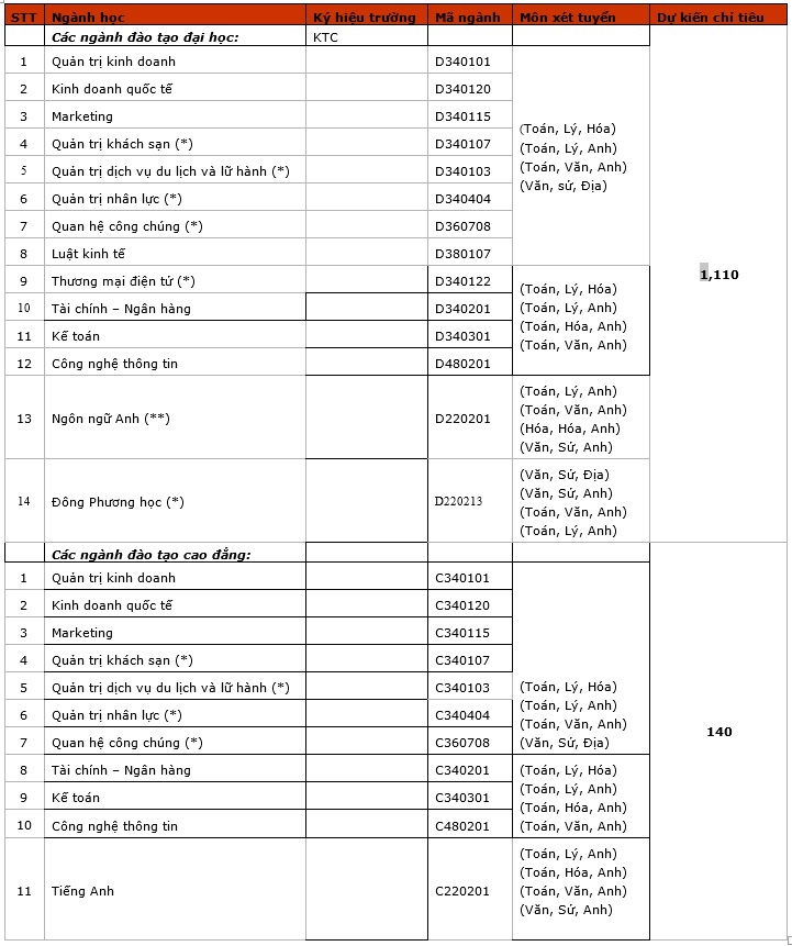 | (*) Ngành dự kiến mở trong kỳ tuyển sinh ĐH, CĐ 2016. (**) Đối với ngành Ngôn ngữ Anh, môn tiếng Anh nhân hệ số 2. |
