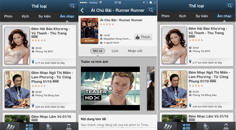 Đây là ứng dụng miễn phí giúp bạn tìm lịch chiếu phim, ca nhạc, kịch và triển lãm cũng như cung cấp đầy đủ ngày giờ, địa điểm diễn ra,... đồng thời tra cứu được cả giá vé và khoảng cách từ địa điểm người dùng đến những nơi diễn ra sự kiện. bên cạnh việc tra cứu thông tin, người dùng cũng có thể tham khảo thêm những nhận xét từ cộng đồng về mỗi địa điểm để quyết định chính xác hơn.