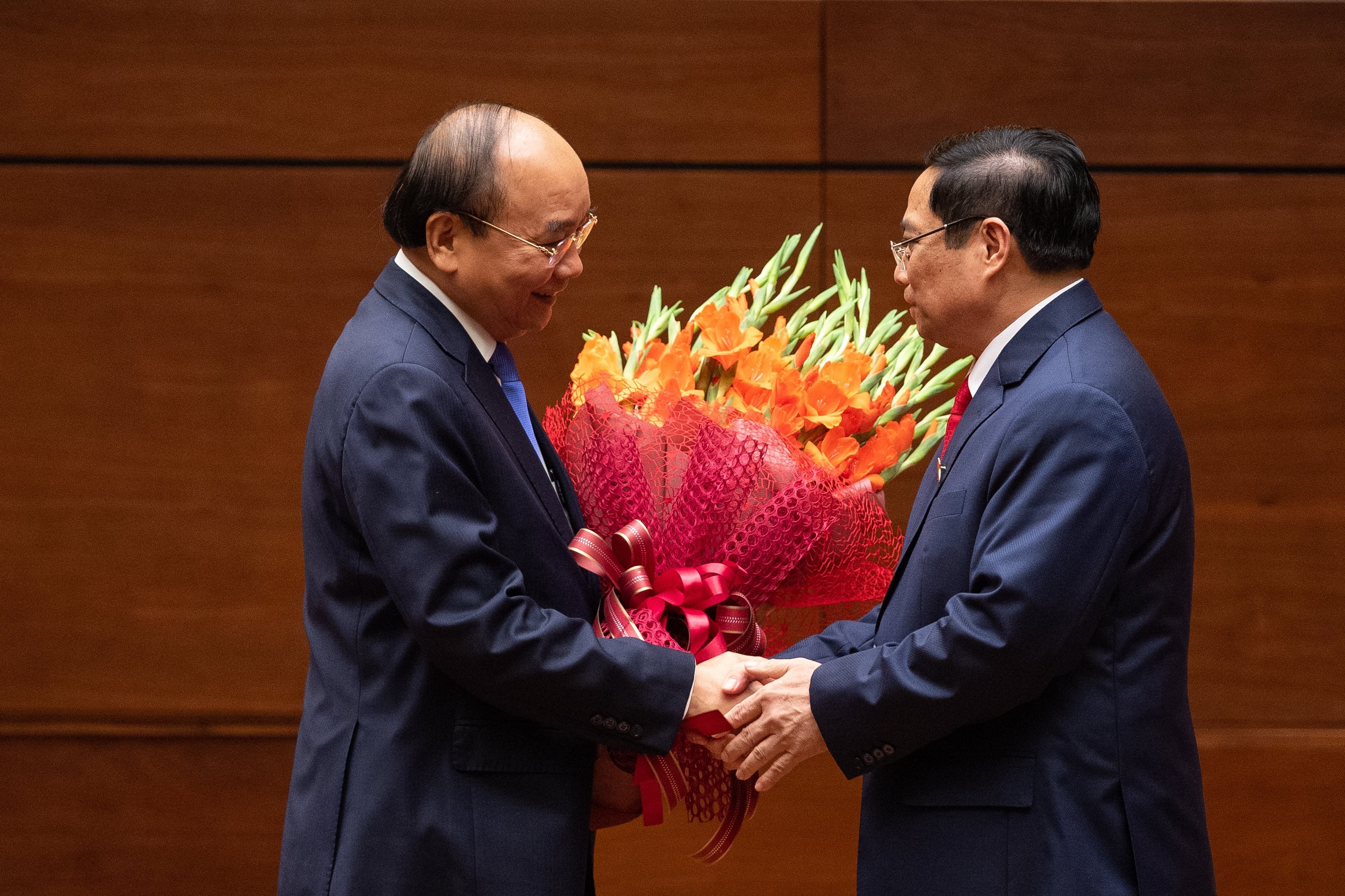 | Tân Thủ tướng Phạm Minh Chính và người tiền nhiệm Nguyễn Xuân Phúc, nay là Chủ tịch nước. Ảnh: Thuận Thắng. |
