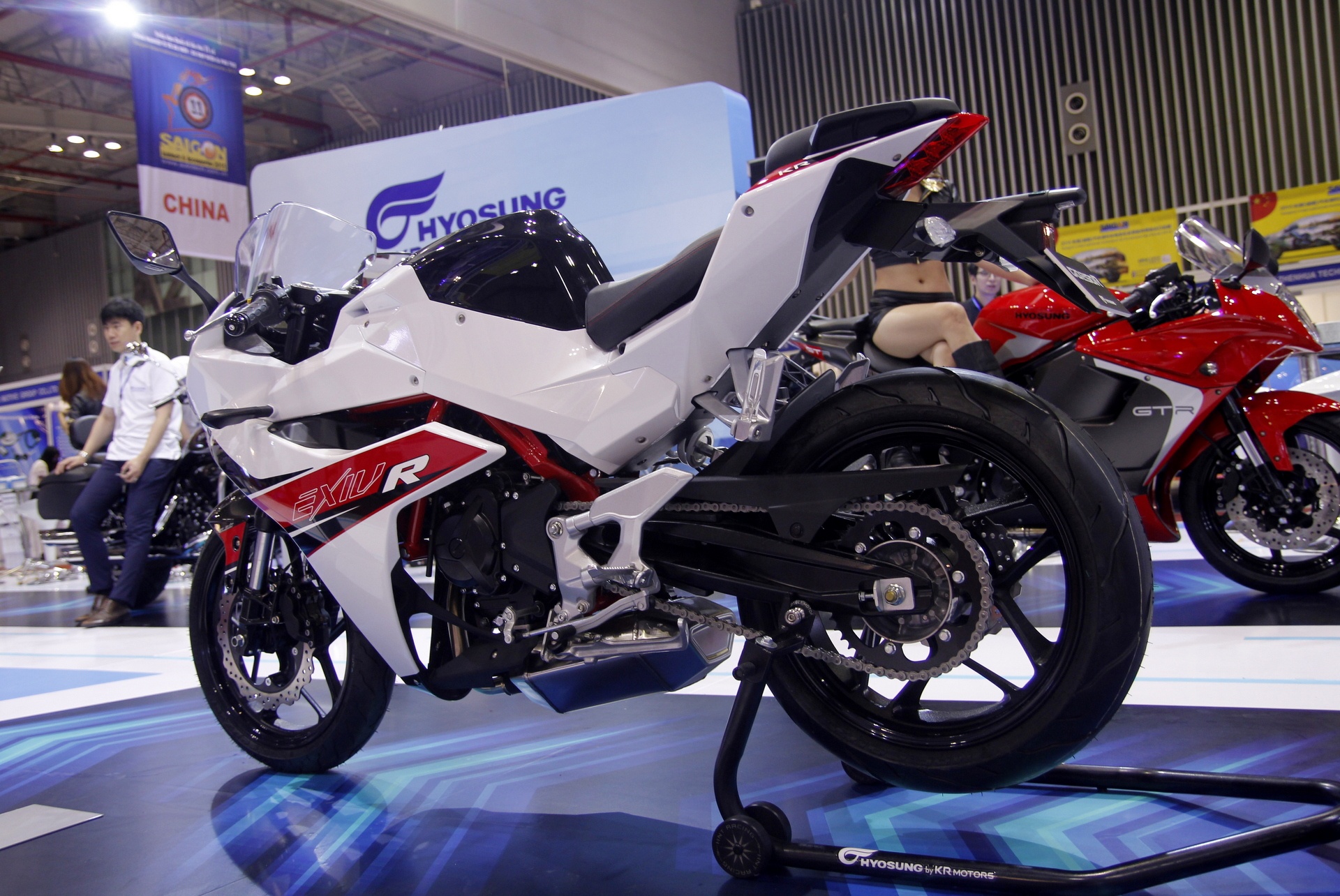 Hyosung GD250R: Hyosung GD250R là mẫu xe khá lạ tại Việt Nam. Xe lần đầu xuất hiện tại triển lãm Saigon Autotech 2015 nhưng gây chú ý bởi ngoại hình bắt mắt. Theo đơn vị tổ chức, mẫu xe này sẽ được phân phối chính hãng tại Việt Nam cuối năm nay, mức giá chưa được tiết lộ. GD250R sử dụng động cơ xi-lanh đơn, DOHC, bốn van/xi-lanh, dung tích 249,4 cc, sản sinh công suất cực đại 28,4 mã lực tại 8.500 vòng/phút và 26,1 Nm mô-men xoắn tại 7.000 vòng/phút, kết hợp với hộp số 6 cấp. Ảnh: Minh Anh. |