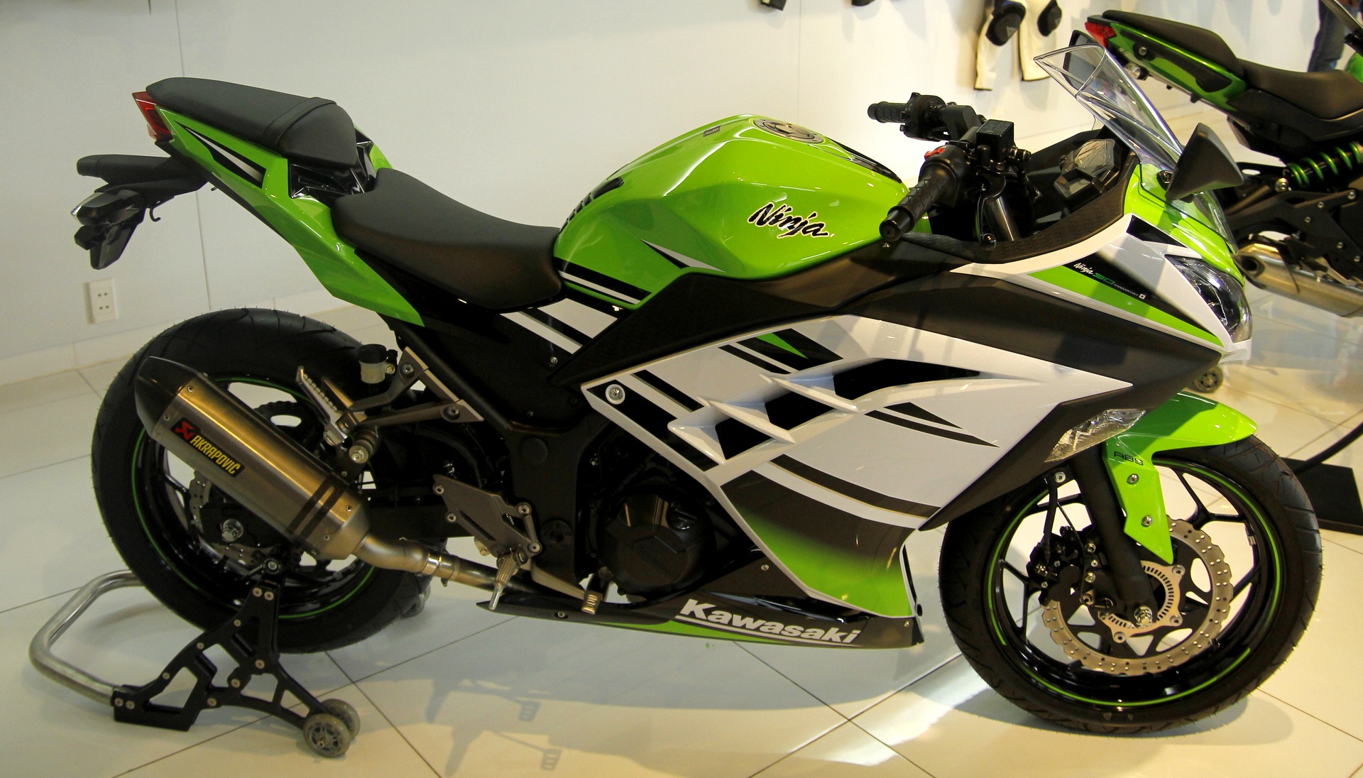 Kawasaki Ninja 300: Ninja 300 đã xuất hiện tại Việt Nam từ đầu năm 2014 thông qua các đại lý không chính thức. Giữa 2015, Kawasaki chính thức nhảy vào thị trường Việt Nam cùng nhiều dòng xe hoàn toàn mới. Ninja 300 được chú ý bởi ngoại hình mạnh mẽ, phù hợp với những người mới tập chơi xe phân khối lớn. Xe trang bị động cơ 2 xi-lanh, dung tích 296 cc, 4 thì, DOHC, công suất cực đại 39 mã lực tại 11.000 vòng/phút cùng 27 Nm mô-men xoắn tại 10.000 vòng/phút. Hộp số 6 cấp. Ngoài ra Ninja 300 còng trang bị ABS cả trước và sau. Tuy nhiên mức giá 196 triệu của Ninja 300 cũng cao hơn đối thủ khá nhiều. Ảnh: Minh Anh. |