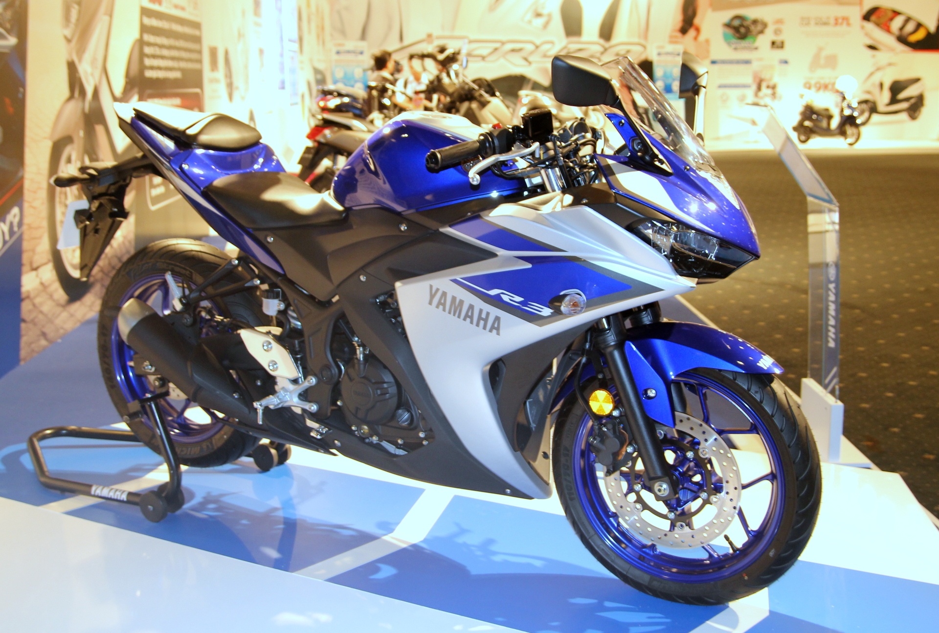 | Yamaha R3: YZF R3 là mẫu xe mới được Yamaha giới thiệu tại thị trường Việt Nam cùng mức giá 150 triệu đồng. Về ngoại hình, R3 không khác nhiều so với R25 tại Indonesia, tuy nhiên bên trong là khối động cơ hoàn toàn mới, mạnh mẽ hơn. R3 được trang bị động cơ 4 thì, xi-lanh đôi, 321 phân khối, làm mát bằng dung dịch, công suất 42 mã lực tại 10.750 vòng/phút và mô-men xoắn cực đại 29,6 tại 9.000 vòng/phút. Xe được tích hợp phun xăng điện tử, sử dụng hộp số 6 cấp. Ảnh: Minh Anh. |