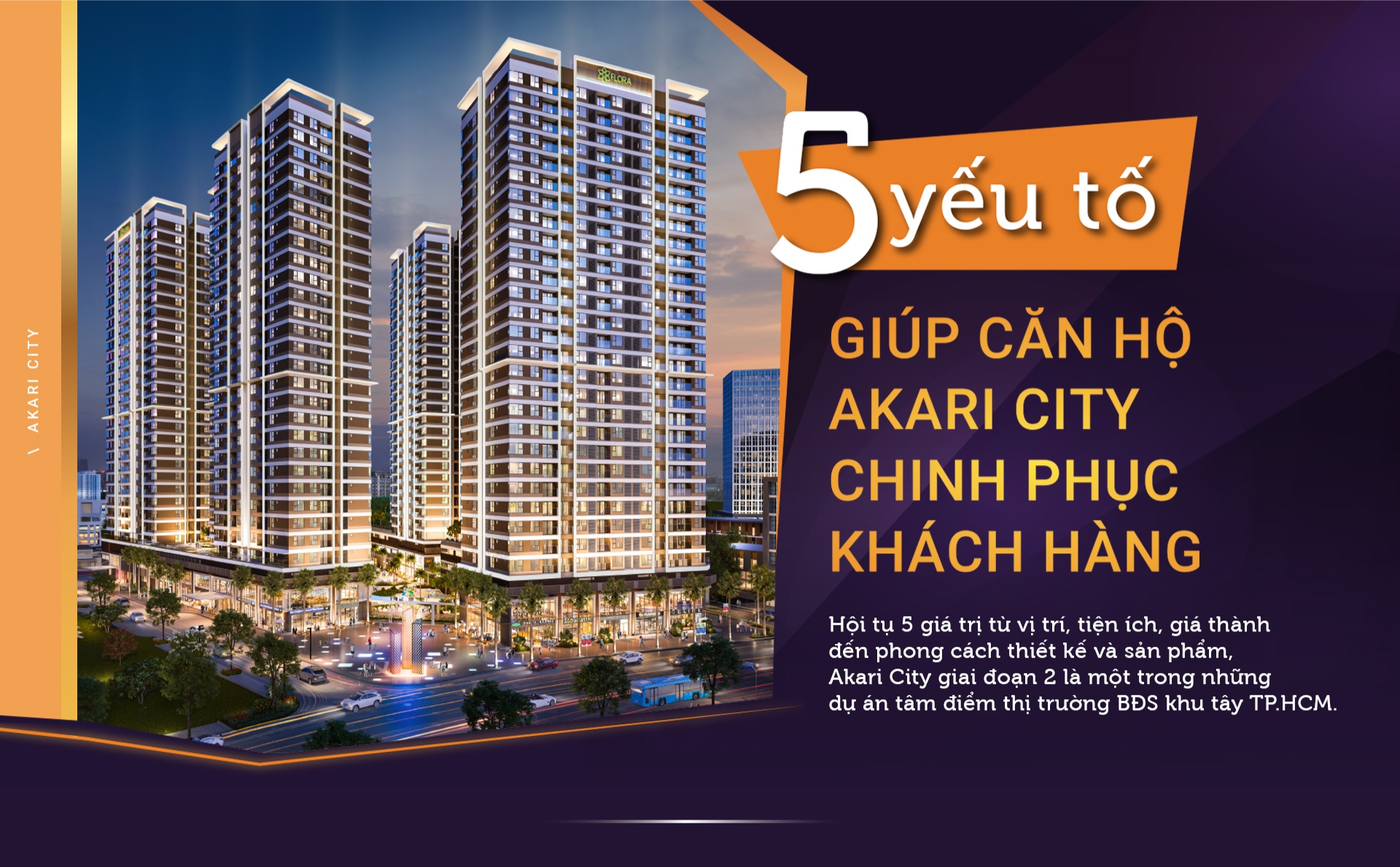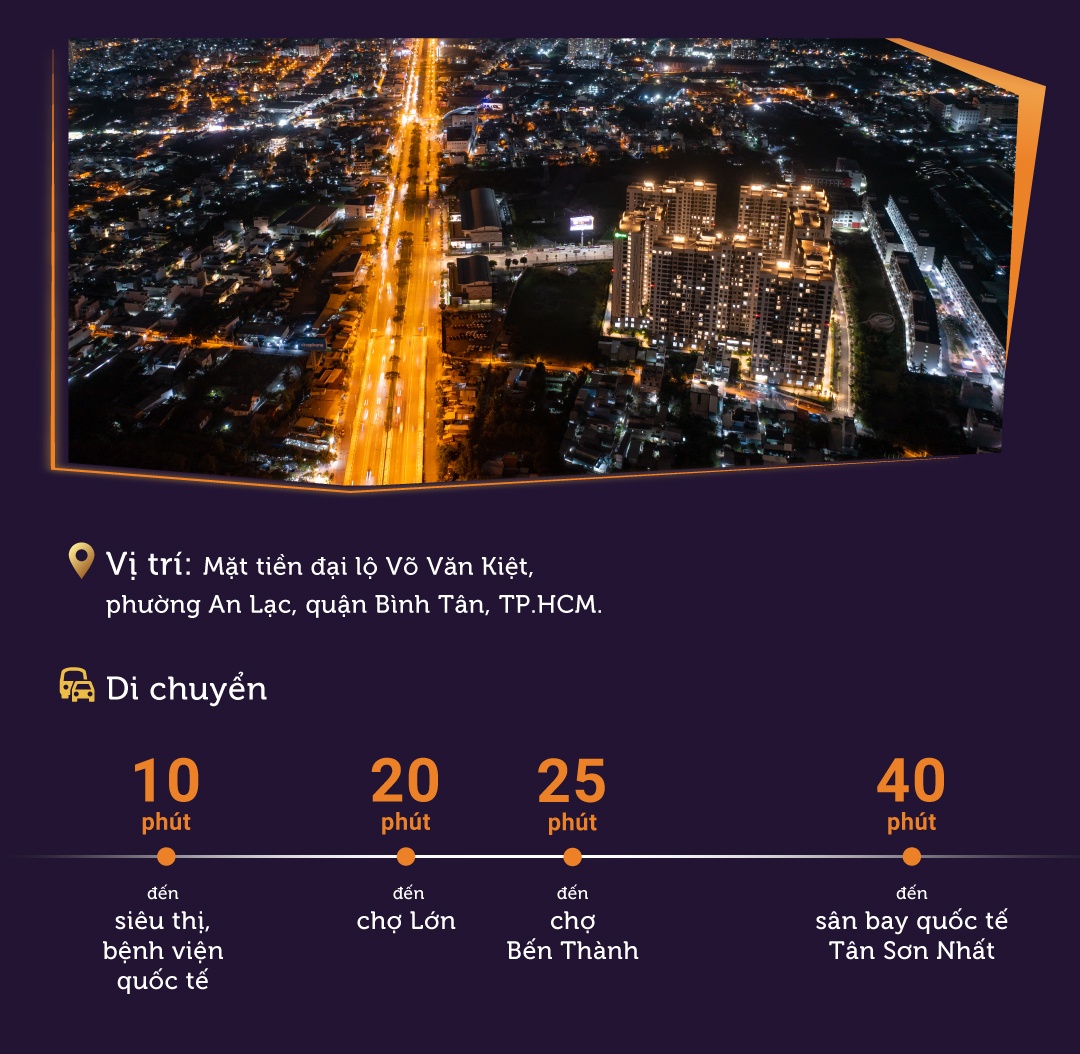 Akari City tọa lạc trên tuyến đường huyết mạch nối liền khu đông và khu tây TP.HCM - mặt tiền đại lộ Võ Văn Kiệt, phường An Lạc, quận Bình Tân. Đây cũng là tuyến đường nối liền 4 khu vực trọng điểm gồm: Khu đô thị mới quận 2; trung tâm hành chính, văn phòng quận 1; trung tâm buôn bán, kinh doanh quận 5 và vùng sông nước quận 4, 6, 8.