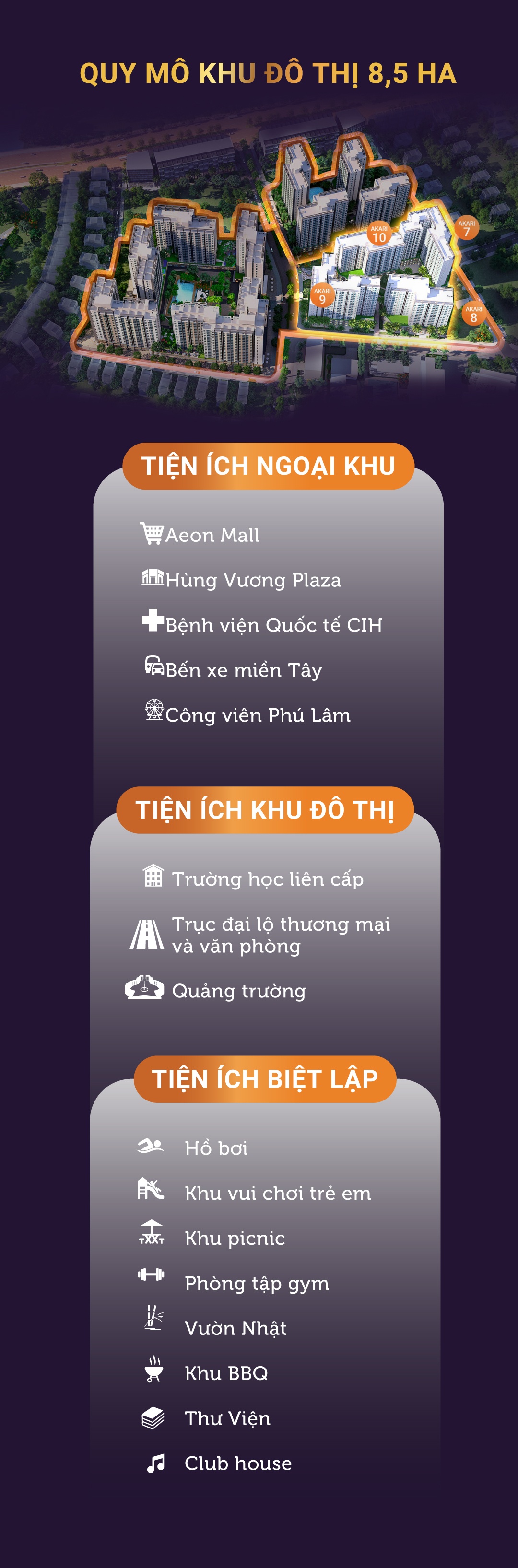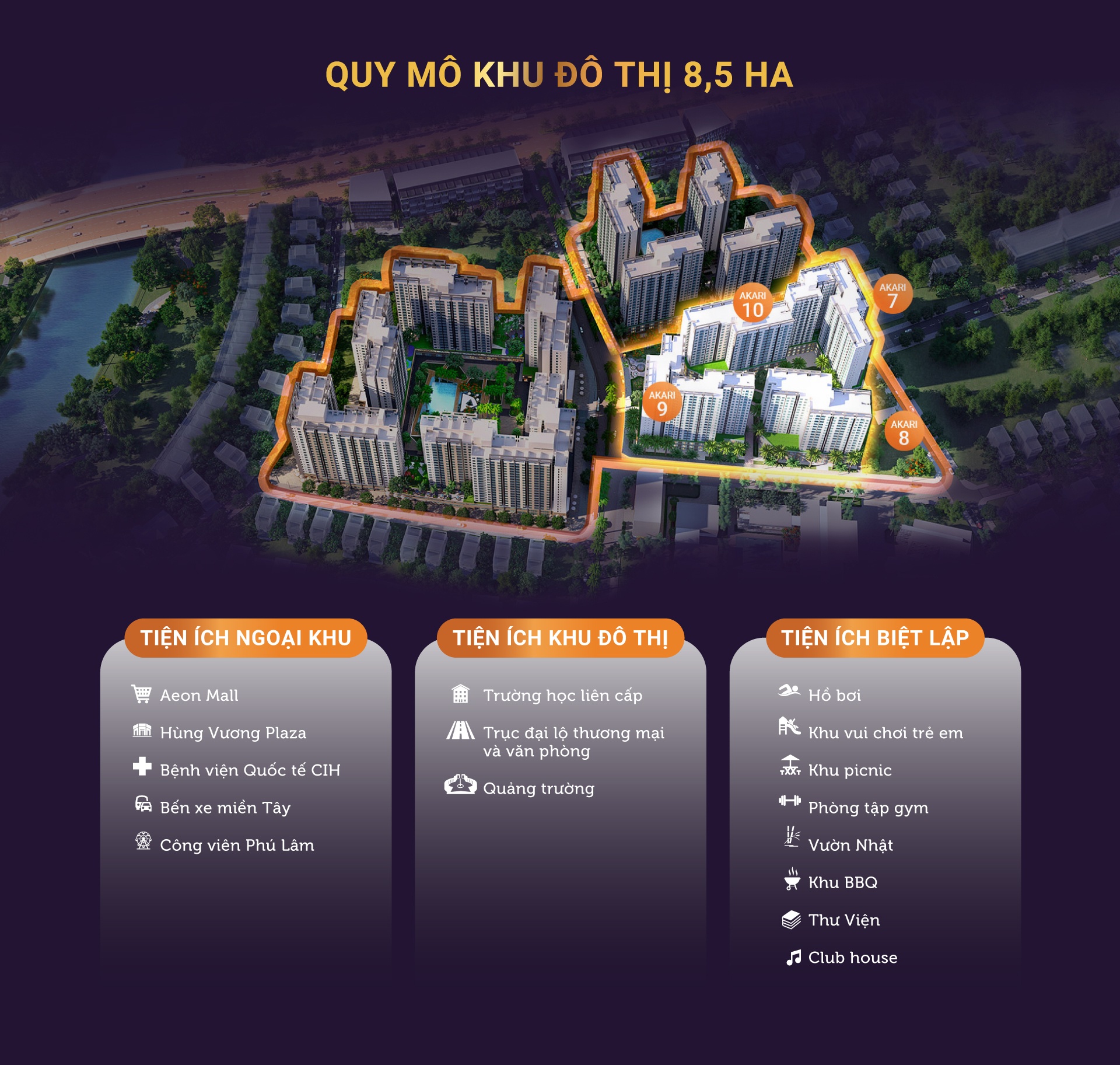 Lớp bao bọc bên ngoài là tiện ích chung tại khu tây. Trong khoảng 5 phút lái xe, cư dân Akari City giai đoạn 2 có thể tiếp cận loạt tiện ích như Aeon Mall, MM Mega Market, Hùng Vương Plaza, Bệnh viện Quốc tế CIH, Bệnh viện Triều An, bến xe Miền Tây, công viên Phú Lâm, công viên Bình Phú...