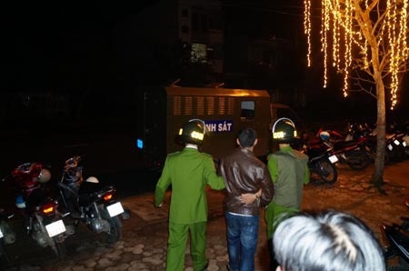 | Lực lượng chức năng dẫn một thanh niên lên xe về đồn. |