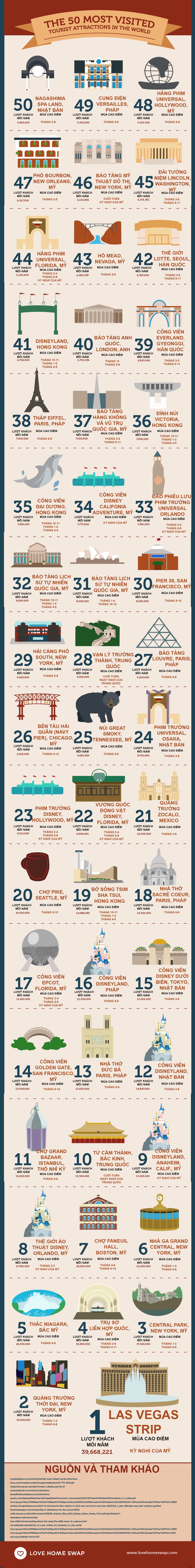 Trang LoveHomeSwap.com mới đây đưa ra danh sách xếp hạng 50 điểm du lịch được ghé thăm nhiều nhất trên thế giới dựa trên số lượng khách mỗi năm.